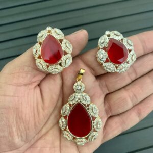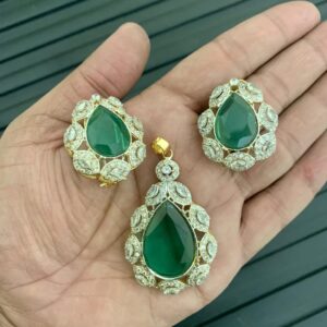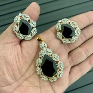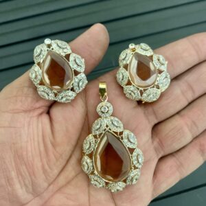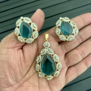 A gold-plated pendant and earring set embellished with white and blue cubic zircon.